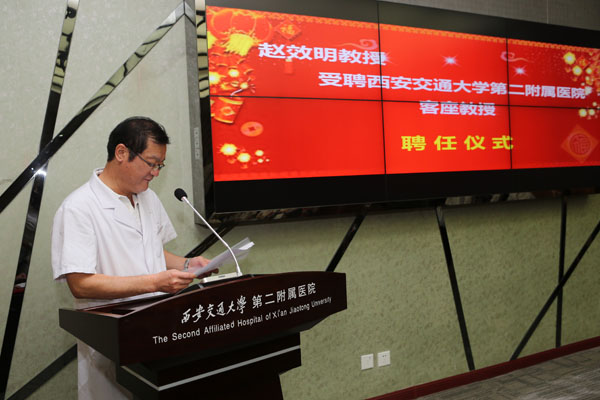 2017年8月25日上午,西安交通大学第二附属医院举行聘任仪式,聘任台湾阳明大学振兴医院眼科主任赵效明教授为我院客座教授。参加仪式的有西安交通大学第二附属医院院长李宗芳教授、副院长张蓬勃教授、眼科主任王峰教授以及眼科全体职工。仪式由眼科副主任王建明教授主持。