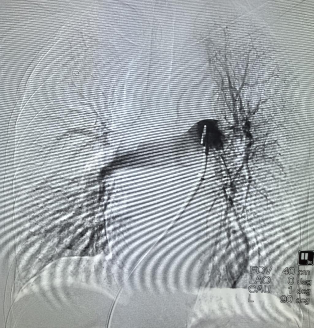 患者入院时,门诊CTPA提示:双肺动脉主干肺栓塞,伴有右心房栓子(性质不确定)、下肢深静脉血栓,经急诊抢救室初步评估为肺栓塞(高危)立即收住EICU。急诊科裴红红主任立即组织EICU李萍教授、急诊科介入团队彭卓副主任、古长维副教授评估患者后,决定给予患者行经导管肺动脉机械取栓术,这样不仅能够抽吸肺动脉栓子,同时能够明确右心房及肺动脉栓子性质。在影像科积极协助下,术中下腔静脉造影见下腔静脉血栓附着,通过精准定位行下腔静脉滤器置入。然后,肺动脉造影,见双肺显影不佳,左肺为著,测肺动脉压50mmHg,行肺动脉血栓抽吸术,术中明确栓子性质为血栓,行肺动脉造影,双肺显影明显改善,复测肺动脉压39mmHg,遂于肺动脉主干留置导管后持续24小时溶栓治疗。后续持续抗凝,患者症状明显改善,2日后转入普通病房,并自由活动,复查心脏B超:右心房未见血栓,现患者已康复出院。