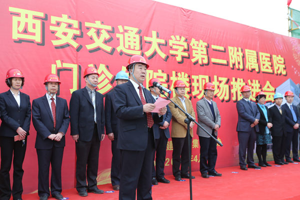 西安交通大学副校长颜虹代表学校和医学部对二附院门诊住院楼的顺利建设表示祝贺,要求在后期的建设中要加大内涵和品牌的建设,为广大的医患提供更好的医疗服务,学院将持续关注和支持。