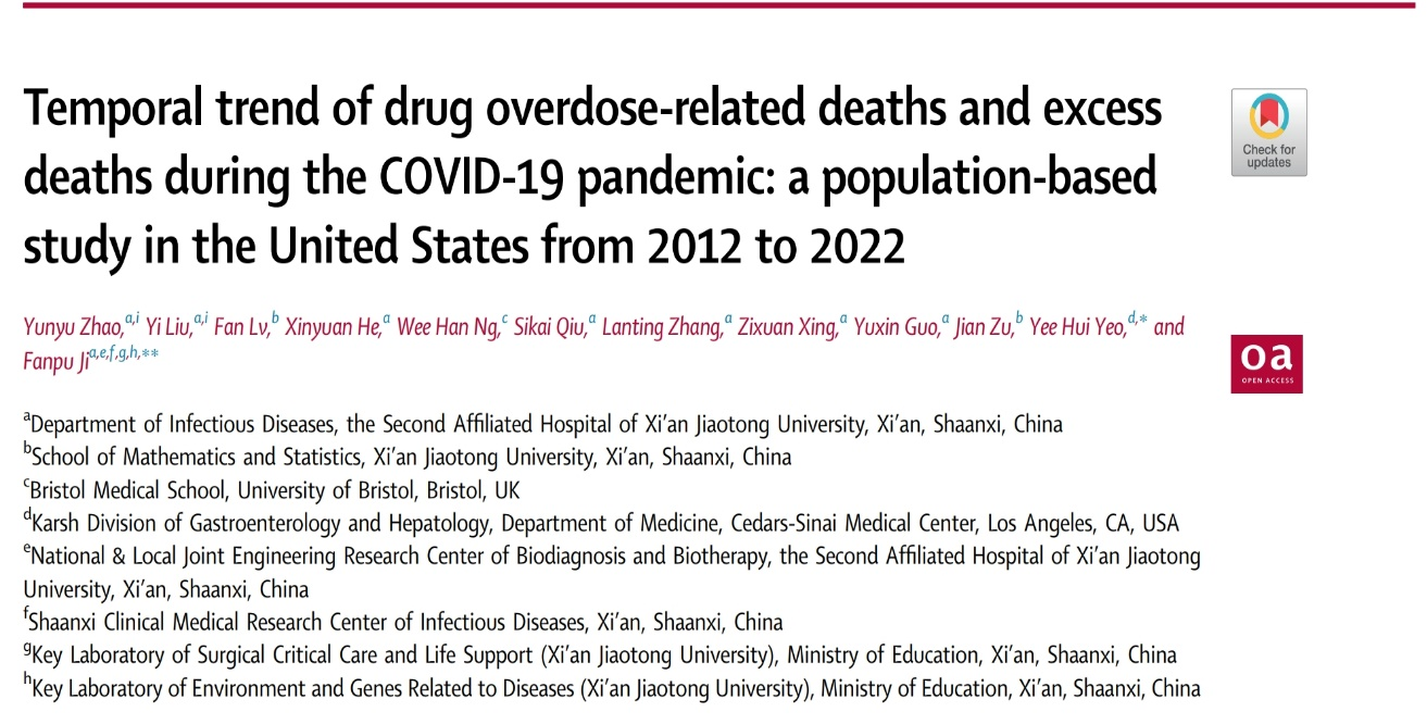 2024年7月26日,柳叶刀子刊《eClinicalMedicine》在线发表西安交通大学第二附属医院感染科纪泛扑教授团队、数学与统计学院祖建教授团队,与洛杉矶Cedars-Sinai Medical Center杨毅辉博士题为“Temporal trend of drug overdose-related deaths and excess deaths during the COVID-19 pandemic: A population-based study in the United States from 2012-2022”(doi.org/10.1016/j.eclinm.2024.102752)的联合研究成果。该研究旨在评估COVID-19大流行前和期间药物过量相关死亡和超额死亡的趋势变化,以及其在不同年龄、种族、地区人群,和不同药物类型中的差异。我院感染科为第一和通讯作者单位,博士研究生赵蕴玉和刘意为第一作者,纪泛扑教授为末位通讯作者。