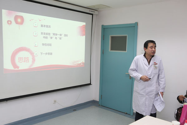 支部书记吉鸿从支部概况、“两学一做”学习教育中的“学”与“做”、存在问题以及下一步思路四个方面全面介绍了支部党建工作和学科发展现况。在“两学一做”学习教育中,支部结合学科实际,开展“要做这样的人”主题活动,即“每天投入工作最早的一个人、集体需要行动最快的一个人、为了患者坚持到最后的一个人、利益面前想自己最少的一个人、医教研工作最努力争先的一个人、医护患评价好评最多的一个人”,并将之作为支部合格党员的实践标准。他特别讲到有着优良的传承,记得自己当住院医师时就经常看到秦兆寅教授、纪宗正教授等老一辈党员每天提前上班,早早来到病房查房,如今很多党员还是这样做,“要做这样的人”六条要求很多党员都在实践,并非过高要求,“榜样就在我们中间,这样的人其实就是我们自己,因为我们大家都有一个共同的名字——共产党员”!如果每个党员都能引领带头,凸显担当与责任意识,树先进,做表率,将“要做这样的人”贯穿在日常工作中,就一定是支部的合格党员。