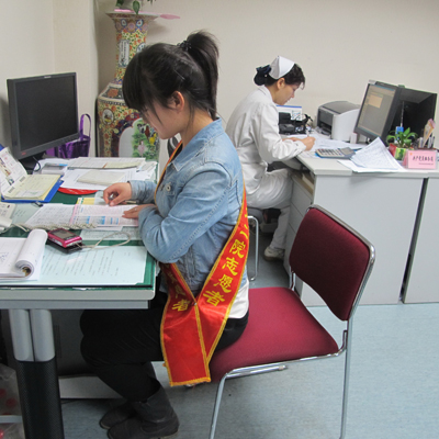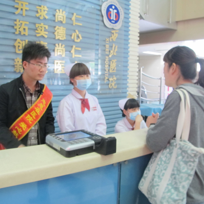 培训结束后,6名学生志愿者分别在门诊服务中心开展文秘工作,在分诊台、门诊总服务台、三楼皮肤科门诊和三楼扶梯处为患者进行就医路线引导和咨询服务。