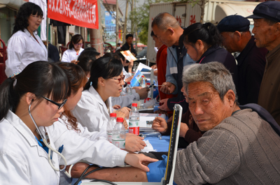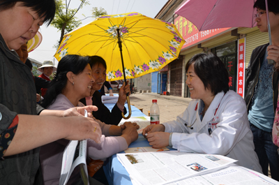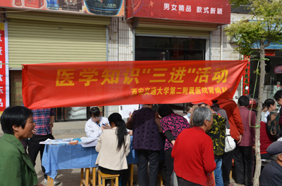 4月14日早上,肾病科党支部组织医护人员19人(其中正式党员8人,入党积极分子5人,肾内科室干部4人)来到礼泉县迁东镇与当地镇卫生所联合举办大型医学知识进基层活动。活动内容主要为义诊、免费测血压、测血糖、进行肾病知识宣传、发放二院院报、二院导医知识手册及肾脏病防治手册等。