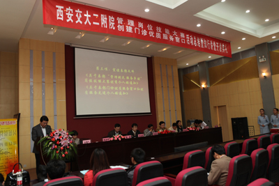 10月25日下午,我院在多功能厅召开了管理岗位技能大赛和创建门诊优质服务窗口活动总结表彰大会。院党委书记韦俊荣、院长贺西京、副院长李宗芳、李文典、高亚、刘原、党委副书记巩守平、黎一鸣、总会计师谢丹出席会议,党政后勤管理科室全体职工、门诊服务窗口相关科室负责人和医务人员近200人参加大会。会议由党委办公室党变玲主任主持。