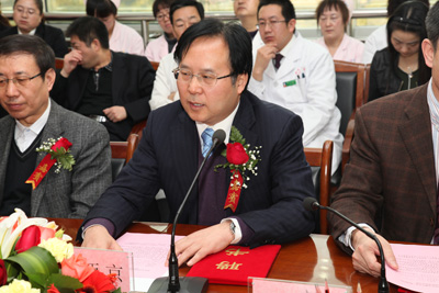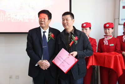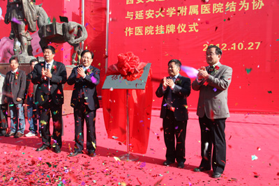 座谈会后在门诊楼前举行了隆重的揭牌仪式。延安市副市长郝宝仓、延安大学校长崔智林、延安市卫生局副局长王汉林、延安市药监局副局长闫彪,我院领导和专家以及延大附院党政领导、相关科室主任、分院及行政人员参加了仪式。仪式由延大附院党委书记李士新主持。马柏林院长在讲话中指出与交大二附院结为友好协作医院是延大附院加快发展,顺应陕北医疗市场需求的重要举措,延大附院将以此为契机,为延安乃至陕北地区群众提供更加优质高效的医疗服务。