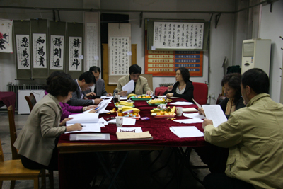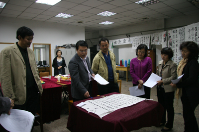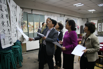 评委参观书法作品并现场打分