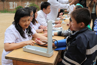 到达武进中学时,下起了小雨,但这并没有阻挡住党员的热情。在迅速地做好了义诊的准备后,郑国玺教授、吴彩芹总护士长,和一同前去的王正辉博士、高天喜和盛颖医生以及薛婷婷、张珍护士都认真、细致地工作,给90多名孩子都做了相关检查。经过义诊,发现有不少孩子有鼻窦炎、过敏性鼻炎、咽炎等疾病的症状。医生给孩子们做了相关健康指导和知识宣教,护士们做了饮食及手卫生的指导。义诊和健康知识讲解纠正了孩子们不良的卫生习惯。