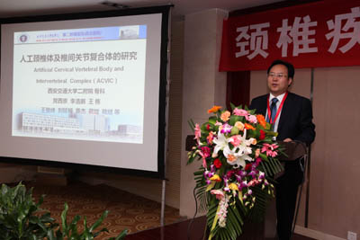 贺西京教授做了“人工颈椎体及椎间关节复合体的研究(Artificial Cervical Vertebral Body and Intervertebral Complex,ACVIC)”精彩汇报,对自行设计的人工寰/枢椎关节I型、II型在动物体内实验上的应用及目前进行的改进的Ⅲ型进行了介绍,对自行研制的下颈椎人工椎体及椎间关节复合体的假体设计、山羊动物模型应用进行介绍。