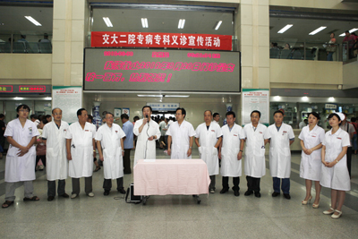 为了让患者更好地了解我院专病专科门诊的诊疗内容和范围,2012年8月30日上午在门诊大厅开展了专病专科门诊义诊宣传活动。贺西京院长、高亚副院长及各专病专科门诊的专家参加了此次义诊活动。