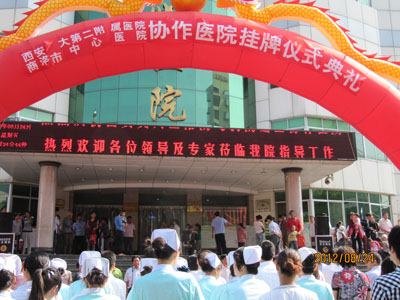 8月24日上午,我院副院长高亚教授、对外服务部主任乔万海教授、肿瘤病院常务副院长王西京教授、耳鼻咽喉病院副院长郑国玺教授、门诊部主任吴世学、神经内科主任吴海琴教授、神经外科周任教授、呼吸内科孙秀珍教授、呼吸内科护士长李家芝副主任护师等一行10人前往商洛市,与商洛市中心医院举行隆重的协作医院授牌、签约仪式。仪式由商洛市中心医院副院长余振南主持,商洛市中心医院党委书记邬文权参会,商洛市卫生局副局长董红梅出席仪式。