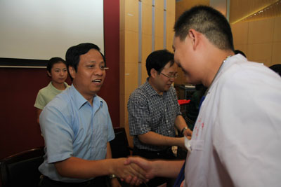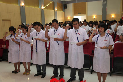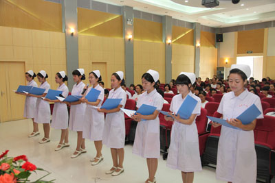 7月26日上午八点三十分,本次岗前培训开学典礼在人力资源部段宗明主任的主持下举行。参加开学典礼的领导有:党委书记韦俊荣、院长贺西京、副院长李文典、刘原,党委副书记巩守平、党委副书记兼工会主席黎一鸣及各职能科室负责人。首先,贺西京院长向全体新职工致欢迎辞,表达对新职工寄予厚望之情,教育大家要从点滴做起、终身学习,感恩互助,塑造美丽的人生与和谐的医院。之后副院长李文典、刘原,党委副书记巩守平、副书记兼工会主席黎一鸣分别向大家介绍了各自分管的工作情况。接着,授牌宣誓仪式庄严举行,各位院领导为新上岗医生代表佩戴胸牌并授予听诊器,全体新职工在刘原副院长的带领下庄严宣誓,誓为我国医药卫生事业的发展和人类身心健康奋斗终生,为二院的发展和美好的未来贡献毕生精力,仪式虽简单却震撼人心。在阵阵誓言的回声中,新上岗护士代表就护理部岗前培训中所学所感做了简单汇报。最后,党委书记韦俊荣讲话,感谢大家加入我们的队伍,嘱咐大家要珍惜来之不易的机会,以一颗奉献之心为医院的荣誉、为医疗卫生事业的进步、为祖国和民族的强大、为我们的共同理想而不懈努力。