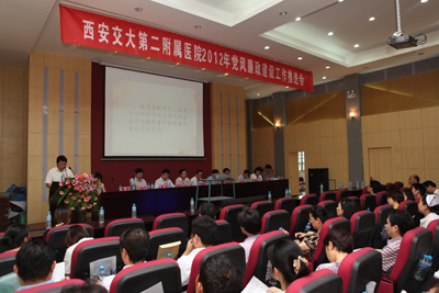 7月13日下午,我院2012年党风廉政建设推进会在多功能厅举行,医院党政领导、党委委员、纪委委员、各科室正副主任、各党支部书记、病区护士长、重点岗位工作人员等共计200余人参加了会议。会议还特别邀请了学校党委副书记、纪委书记赵昌昌、学校纪委监察处副处长韩永君莅临指导,会议开始之前播放了警示教育片《防患未然》。推进会由院长贺西京教授主持。