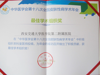 我院皮肤病院积极组织科室成员参与本次会议,以51篇稿件总量荣获最佳学术组织奖,位居全国各单位投稿总量第5位。其中肖生祥教授、郑焱副教授分别作了题为“维A酸治疗角化性皮肤病”,“LL-37可保护线粒体免受炎症性损伤”的大会发言、冯义国副教授进行了疑难/典型病例展示,受到广大与会者的好评。