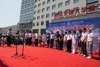 在国际儿童节即将到来之际,我院与北京屈正爱心基金会合作救助贫困先天性心脏病儿童“大爱正心”公益活动正式启动,该项慈善活动得到了我国一线著名影视界人士张嘉译、李琦、苗圃、孙菲菲、倪大红、冯远征、梁丹妮、颜丙燕、杨志刚、吴军以及央视6频道主持人瑶淼、BTV生活频道主持人高燕的资助,此次爱心活动对12位来自陕西当地贫困家庭的患儿采取“一对一、点对点、全透明”的形式,每人资助一位贫困先天性心脏病儿童在我院心血管外科进行手术治疗。