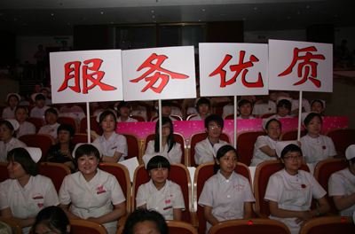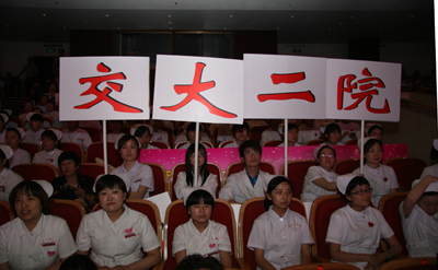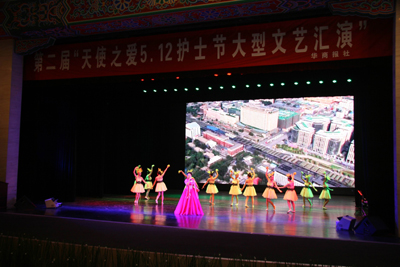 我院选送的节目是歌伴舞《中华大舞台》,由来自临床和管理科室共14名演员倾情表演。由后勤服务部的金璇担任该节目的主唱,音乐专业本科毕业的她,唱起歌来底气十足、声音浑厚,音域宽广、十分大气。其余的十三名演员分别是由门诊部、重症监护室、急诊科选拔出来的,她们伴随着金璇的歌声,变换着各种舞蹈动作,赢得了阵阵掌声。同时,院团委组织了各团支部护士代表和学生团员近50人观看了此次文艺汇演,作为我院的啦啦队团员青年们打出了“交大二院、给力加油”的牌子,并在我院节目开演和结束时喊出“交大二院、给力加油,优质服务、质量第一”的口号,宣传我院的同时,更鼓舞了台上的演员。