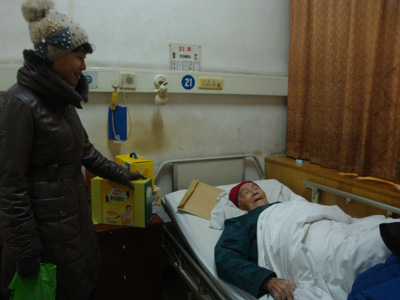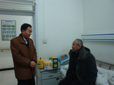 1月21日一大早,离退休职工管理办公室主任叶泽宇、副主任赵小荣带着慰问品,冒着飞舞的雪花和刺骨的的寒风,代表医院分别到康复科、眼科慰问住院的离退休职工王志刚教授和95岁高龄的阎秀英老人,把医院对离退休职工的关心、关爱和关怀送给住院的离退休职工和家属,并祝福两位职工早日康复,全家过一个祥和、幸福的春节!尽管室外天寒地冻,可病房里暖意融融,被看望的职工和家属十分高兴,他们感谢医院的关心、关爱和关怀。尤其是95岁高龄的阎秀英老人激动的说:“我都快96岁了,非常感谢医院一直关心我们,还在过年的时候来看我,一定要把我们对医院的感谢带给院领导,谢谢!”