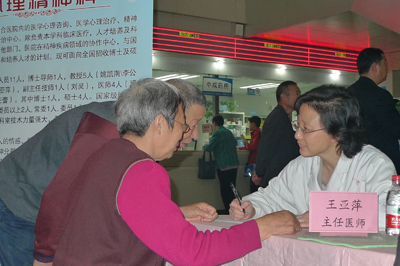 为配合今年精神卫生日的主题活动,10日上午8时,义诊活动在门诊大厅准时开始,由心理精神科主任王亚萍教授带领多位专家为广大群众进行义务咨询,并发放相关宣传资料。