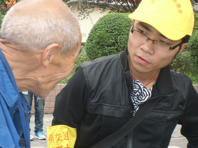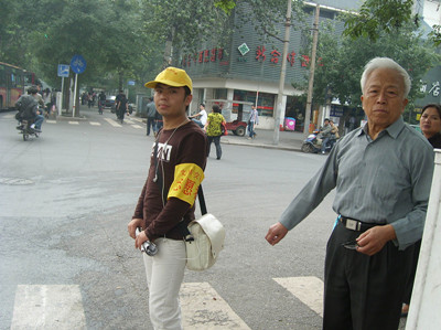 ?9月15日上午,院团委组织李彩霞、党洋和吴磊等三名志愿者抵达尚勤路和西五路十字路口参加创建省级文明单位的志愿服务活动。