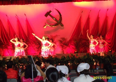 九十年前,苦难深重的旧中国积病缠身,笼罩在浓重的乌云里,在风雨中飘摇。内忧外患,民不聊生。是中国共产党——斧头和镰刀的相聚,工人和农民的携手,像漫漫长夜里一盏灿烂的灯塔,照亮眼前的道路,指引前进的方向。是中国共产党,给灾难深重的中国人民带来了光明和希望,在中国的大地上卷起改天换地的红色浪潮。是中国共产党,解救受苦受难的中国人民于水生火热之中…是的,没有共产党就没有新中国,我们应该感谢党,时刻跟党走。七一,党的生日,这是多么值得庆贺的日子。工会一部门主要是有内科科室组成,科室日常工作繁忙,但是大家还是毅然的报节目来庆祝党生日。大家每天辛苦上班,下班了虽然带着一身疲惫,但是我们的美女们立刻整理心情,抖擞精神,参加排练。各科护士长,尤其是神经内科和肾内科的护士长深知各位演员的劳累,在精神上给予了大力的支持。马立群主席、靳庆芝文体委员、王虎清宣传委员每天下午6点准时来到排练场地,给予各位演员以鼓舞和关怀,王俊红组织委员和杨文英女工委员积极帮助解决在排练中遇到的一切困难,比如场地,音响,经费等等问题。