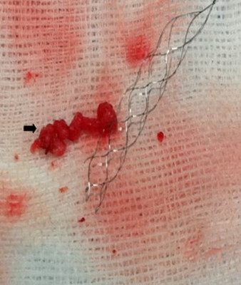 考虑患者年轻,一般情况可,建议可急诊行介入下脑动脉内取栓手术。经患者家属同意后,急诊行全脑血管造影,造影见患者右侧颈内动脉颅内段于眼动脉处成残端,右侧大脑中动脉和右侧大脑前动脉均未见显影,即患者是右侧大脑半球全部缺血,病情危重,命悬一线,取栓需要分秒必争。最终经过约2小时的急迫手术,我神经内科介入小组成功从患者颅内血管闭塞处取出多枚栓子,总共约2CM长,实现颅内血管完全再通(见图1-3)。