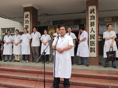 为了贯彻执行卫生部“三好一满意”活动政策方针,营造人民群众满意和谐的医疗环境,促进我院与各级协作医院之间的医疗技术交流和双向转诊,应武功县人民医院的邀请,5月28日,对外服务部乔万海主任带领我院专家吴海琴、张开放、王进海、杨文斌、董西林、权彦龙、朱参战、周乐、周戬平等一行11人赶赴武功县医院,进行为期一天的大型义诊、疑难病查房及病案讨论活动。