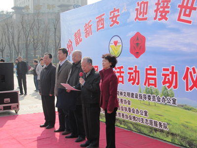 3月27日上午,由省文明委、省慈善协会、西安世园会执委会共同主办的 “扮靓新西安 迎接世园会”慈善志愿者活动启动仪式在新城广场隆重举行。