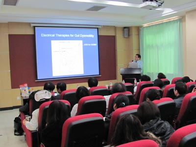 ?应我院邀请,美国胃肠电协会主席、美国德洲大学医学部消化临床生理学实验室主任、美国胃肠病学院院士陈建德教授于 2月23日来我院消化内科进行访问及学术讲座。陈建德教授在消化科讲学厅做了题目为“胃肠动力性疾病进展” 的学术报告,就胃肠电生理起搏在消化道运动障碍性疾病治疗中的应用、胃肠动力疾病相关的科研思路、SCI论文的撰写技巧等做了深入浅出的讲解,受到与会同行专家及研究生的一致好评。讲座前,我院李宗芳副院长代表医院向陈建德教授表示热烈的欢迎并赠送了礼物。