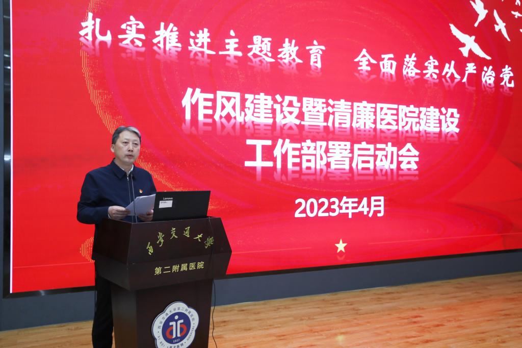 接着,党委副书记滕文葆对医院全面从严治党重点工作作出部署安排,指出医院全面从严治党工作部署会,也是开展医疗领域群众身边腐败和作风问题专项整治工作、建设清廉医院工作、深入推进作风建设工作布置会,四项工作是省纪委、省卫健委、学校和医院从不同侧重点督促医院压实管党治党责任、健全现代医院管理、规范医院内部权力运行、促进医院治理水平和服务效能提高的重要抓手。同时就如何贯彻落实提出3点要求:一要思想认识到位。各党支部书记、科室主任要重视行业腐败问题,提高政治站位,以身作则,做好表率,不断完善内部管控措施,依法依规执业。二要措施落实到位,各职能部门要形成合力,以刀刃向内的决心、夯实责任的态度、狠抓落实的毅力确保工作取得实效。三要执纪监督到位,院纪委要履行政治监督职能,做到督促不包揽、推动不代替、到位不越位。