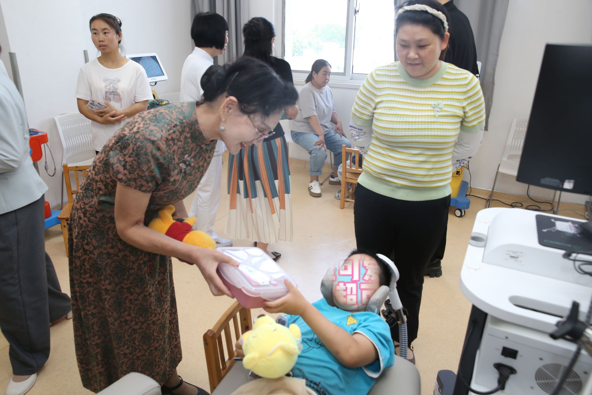 活动开始,儿科主任杨琳教授携各位参会嘉宾来到儿童康复中心,看望正在接受康复训练的患儿,并为患儿送上了节日的祝福以及学习用品、玩具。看着孩子们脸上洋溢的笑容,现场的每一个人都深受感动。一位家长激动地说:“感谢社会各界对我们的关注和支持,各界温暖的关爱,让我们看到了孩子康复的希望,也让我们更有信心面对未来的挑战。”