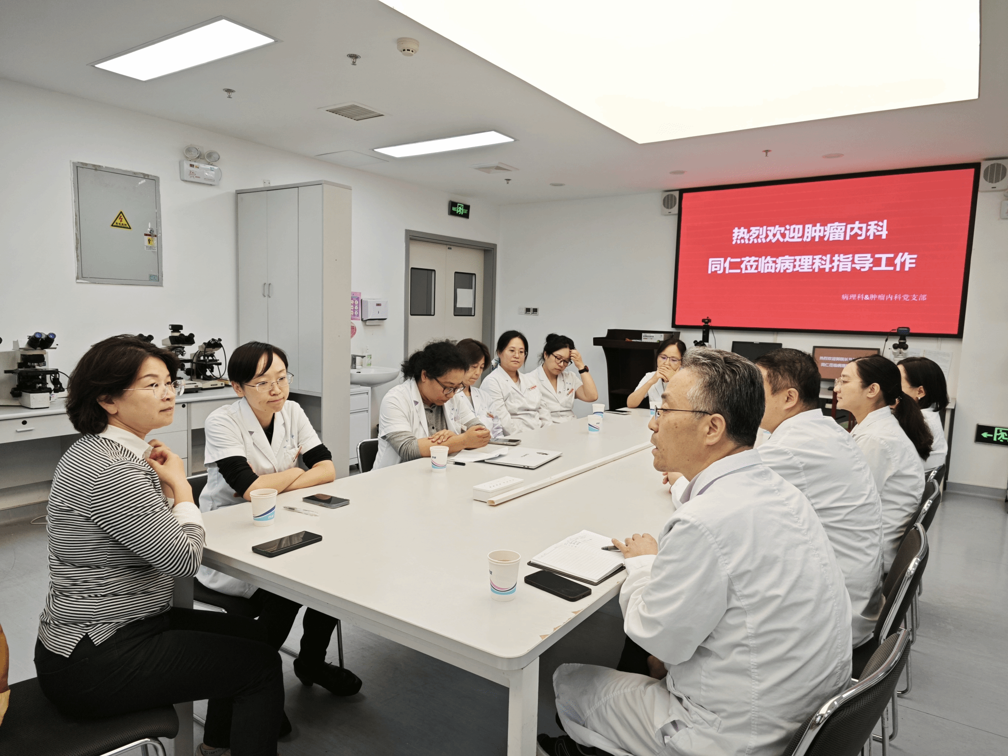 为进一步加强多学科协作、提升肿瘤诊疗质量,2025年9月17日下午,在郭卉副院长带领下,肿瘤内科尹晓然副主任、昝瑛副主任、张寅斌支部书记及肿瘤内科带组教授等一行人前往病理科就肿瘤-病理亚专科建设、病理分子检测、科研合作和学科建设等方面进行了深入沟通。双方并就肿瘤-病理亚专科建设,常规样本送检、缩短报告时长,拓展分子检测项目,共同推进临床研究项目等具体事项达成共识。
