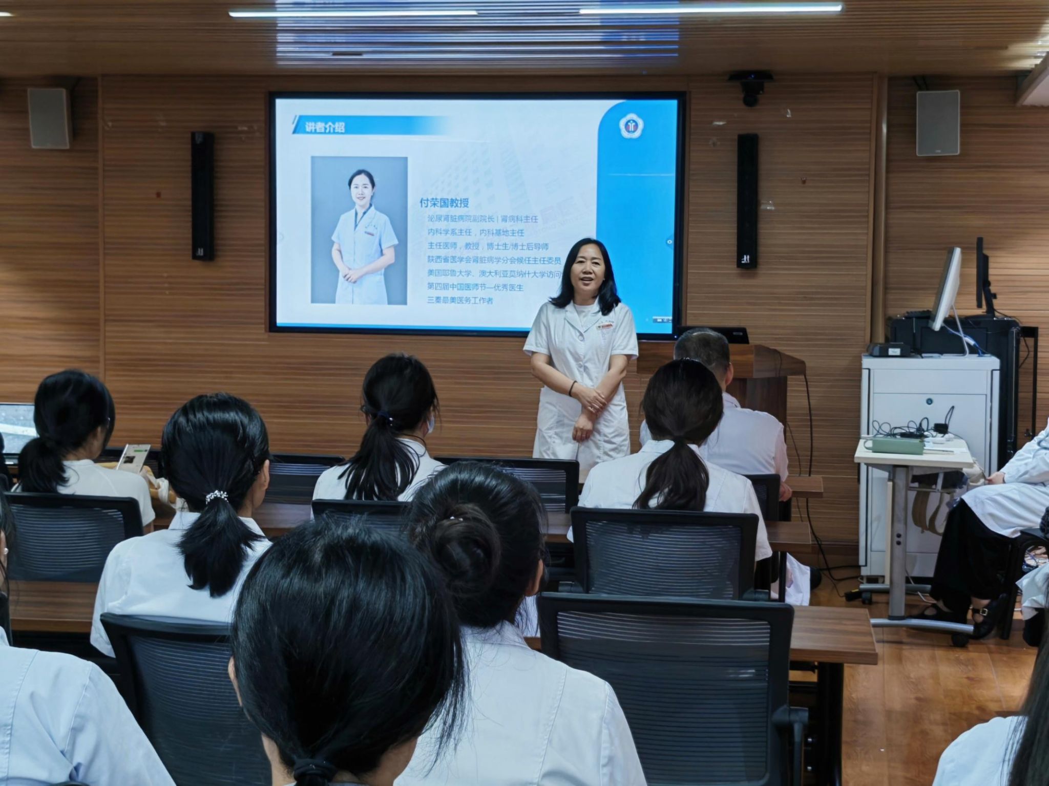 会议在内科学系主任付荣国教授的开幕致辞中拉开帷幕。她强调了住院医师规范化培训在医学教育体系中的关键作用,并呼吁全体师资以高度责任感和使命感共同提升培训质量。随后,内科学系副主任焦杨为2025级新学员作了系统的“入基地宣教”,就内科住培基地的组织架构、师资队伍、培训目标、轮转计划、教学活动及考核方式等内容进行了全面介绍,帮助新学员明晰培训路径与要求,熟悉学系环境。