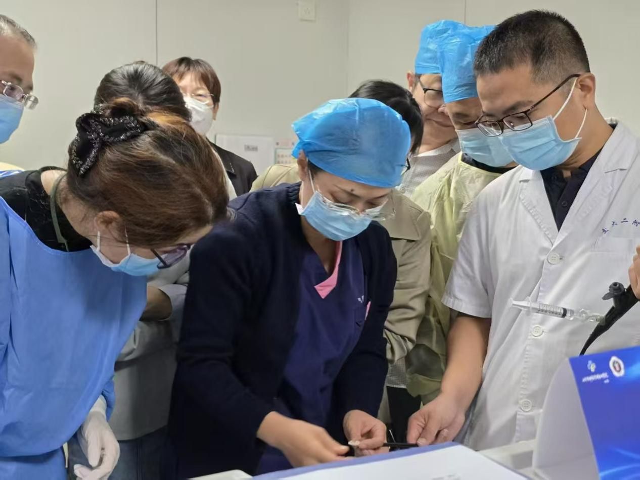 模型操作练习环节成为本次培训的亮点。由单虎、张永红主治医师及谢梅、吕洁护士组成的导师团队,为学员提供了一对一指导。学员在超声支气管镜模拟器上积极练习淋巴结定位和穿刺深度控制等关键技术,在零风险的模拟环境中反复打磨操作手法。导师及时纠正偏差、解答疑问,现场互动热烈,学员反馈收获显著。
