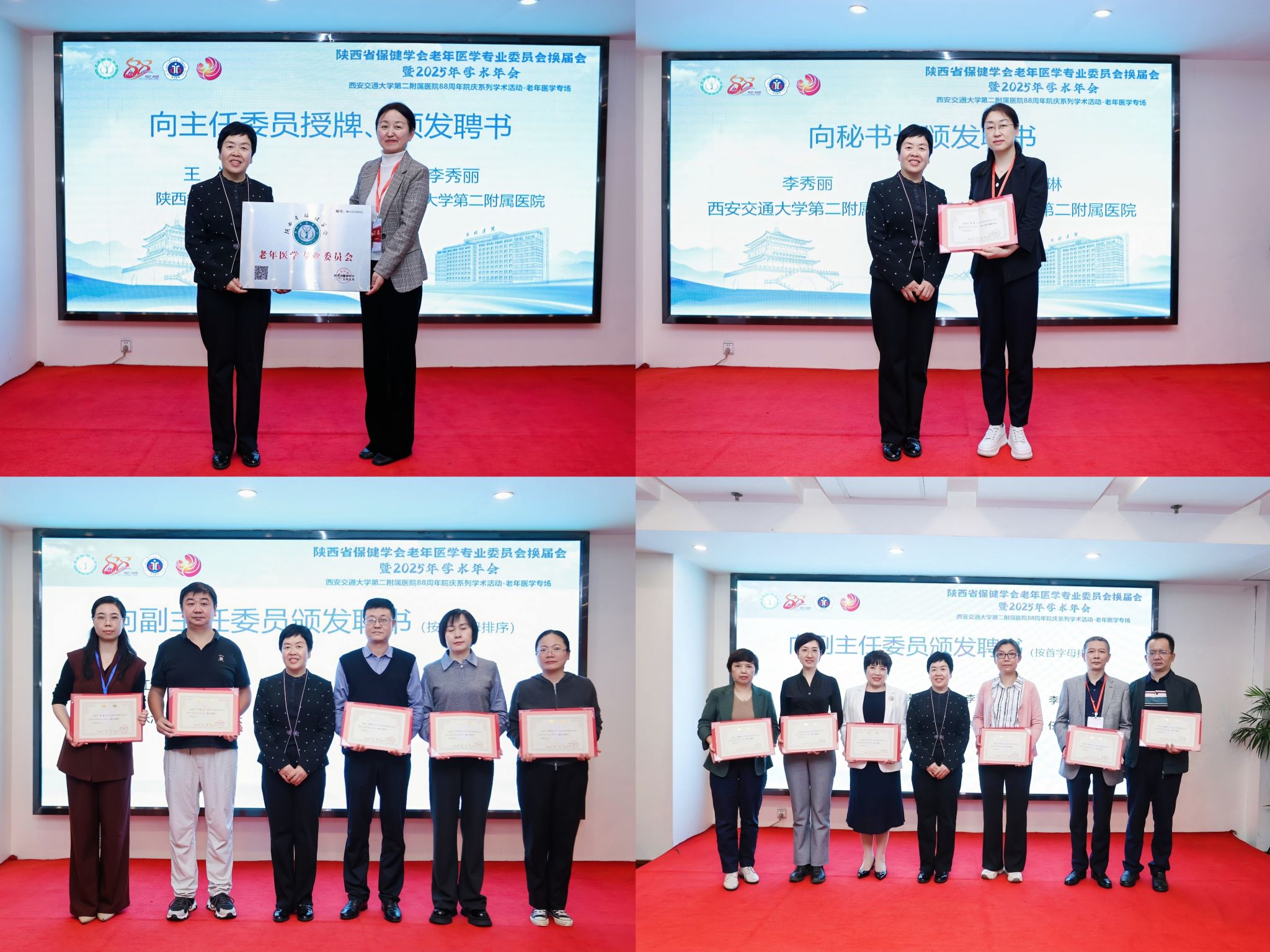 随后,会议举行了陕西省保健学会老年医学专业委员会换届仪式。学会会长王岚致辞,充分肯定上一届专委会的工作成绩,并对新一届专委会提出期望。李秀丽主任连任新一届主任委员,她汇报了专委会过去的工作成果与经验,并表示将继续带领全体委员推动老年医学事业的发展。学会秘书长朱建宏宣读了换届批复文件及第三届常委会名单,会议依次进行了主任委员授牌及聘书颁发、副主任委员、秘书长及常务委员聘书颁发等环节。会员服务部副会长袁鑫介绍了专委会的工作任务及会员的权利义务,为新一届专委会的工作开展奠定了基础。
