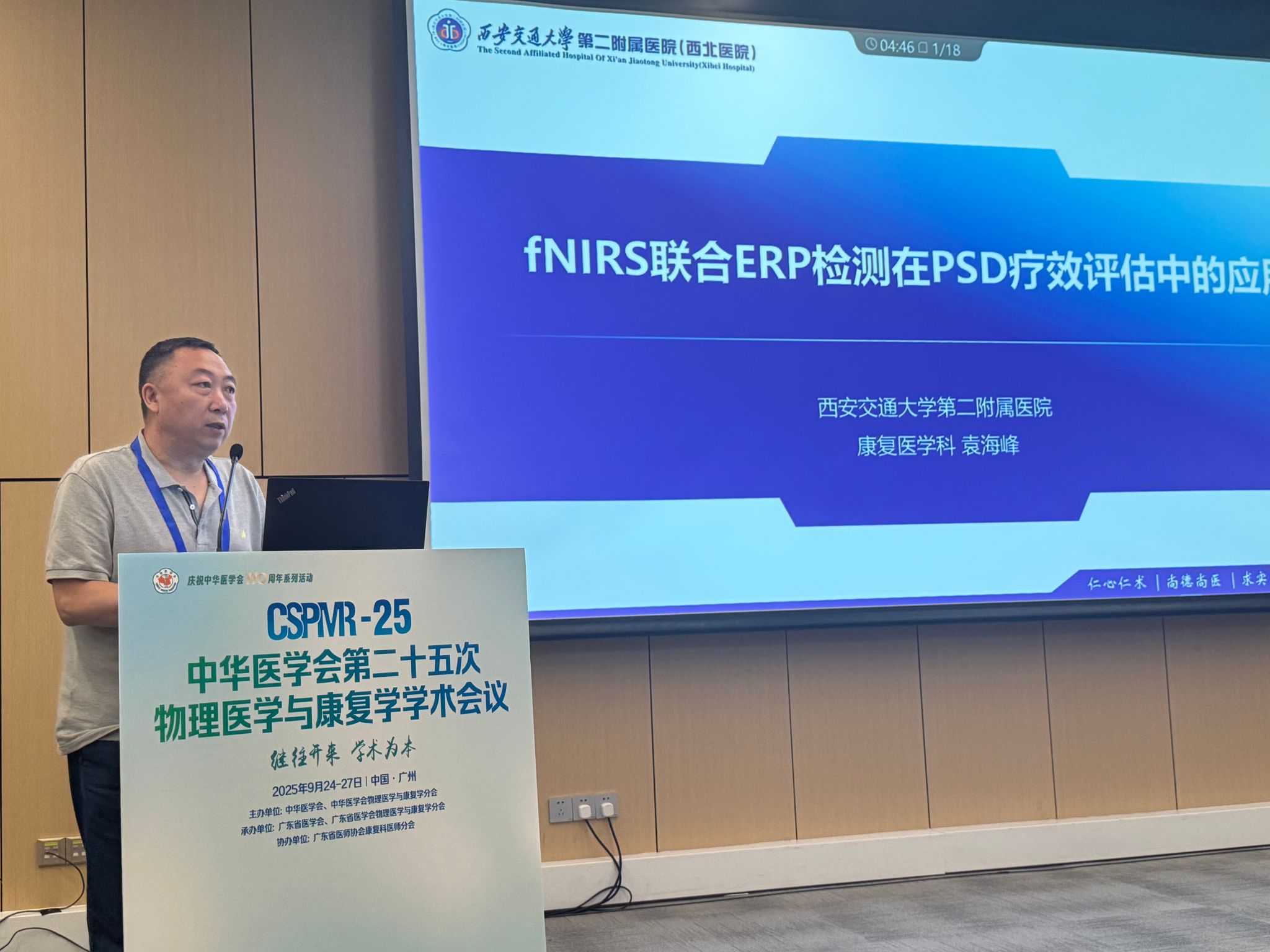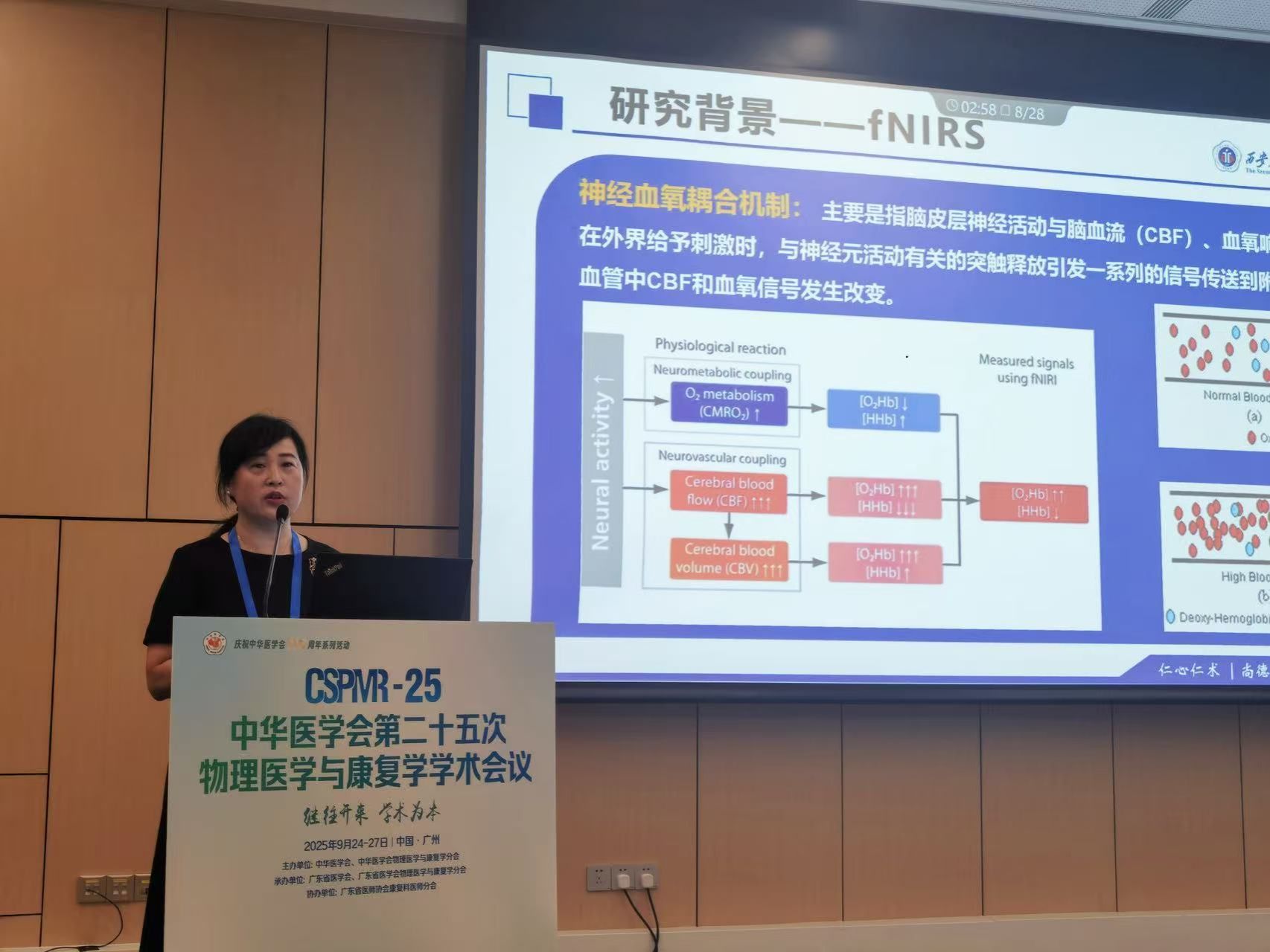 在脑功能研究与神经调控技术应用方面,科室报告了一系列创新性研究。乔鸿飞主任在论文发言中汇报了《基于fNIRS的口腔内电刺激对脑卒中后吞咽障碍康复效果的影响研究》,进一步深化了吞咽障碍的精准评估与治疗。袁海峰教授的口头发言《fNIRS联合ERP检测在PSD疗效评估中的应用》,则展示了多模态神经生理技术在康复疗效评价中的价值。惠艳聘副主任就《iTBS联合FVC改善脑干卒中患者吞咽功能障碍:一项基于fNIRs的临床研究》进行口头发言,探讨了脑神经调控技术与康复治疗结合对吞咽障碍的疗效及其机制,创新了吞咽障碍康复新方法。此外,王斌治疗师报告了《利用fNIRS技术观察前交叉韧带重建术后患者大脑运动功能区变化的研究》,为运动损伤的中枢机制提供了新见解。