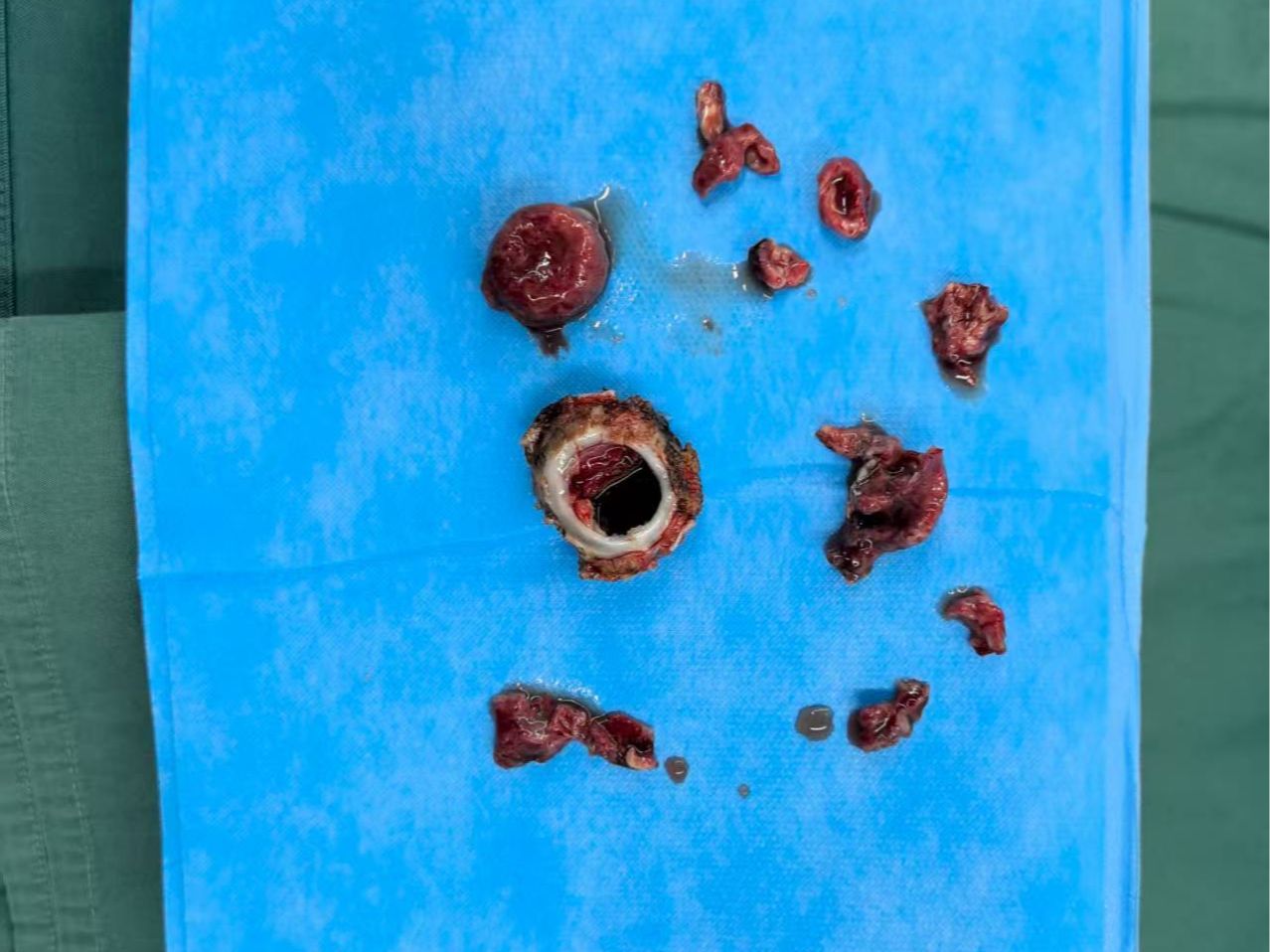 图为拆除的二尖瓣机械瓣及左心房内血栓