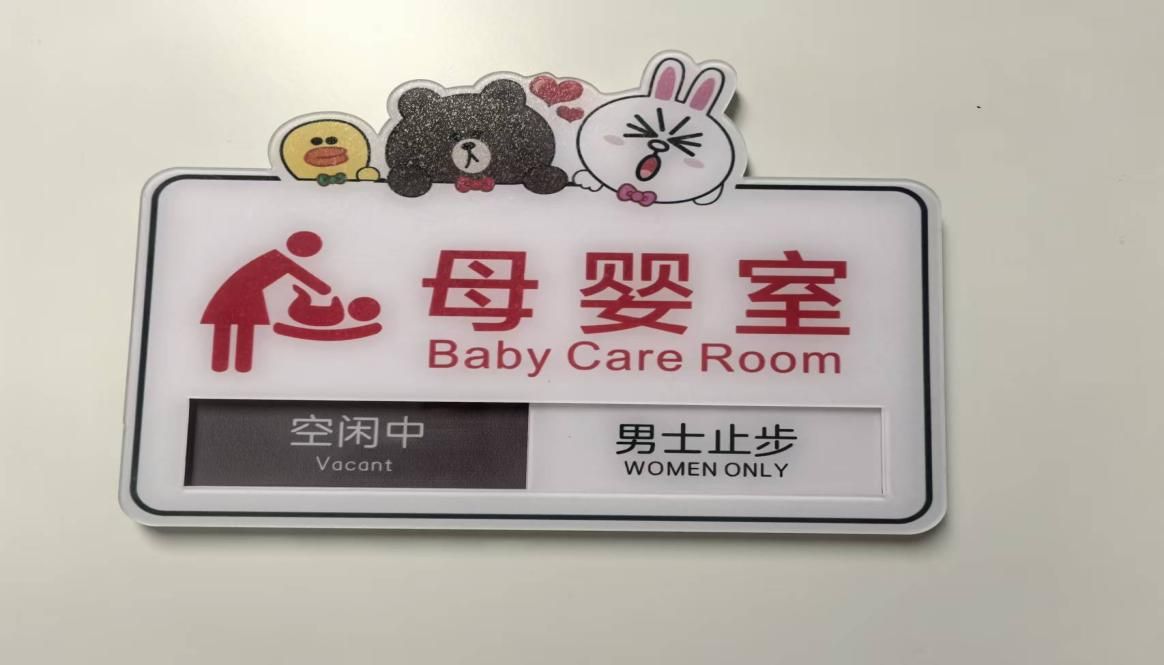 改造后的母婴室门口,新增了带有可爱卡通形象的标识牌,“母婴室”、“空闲中”、“男士止步”、“使用中”的提示清晰醒目,既充满童趣又明确了空间属性,让母婴群体能快速识别、安心使用。