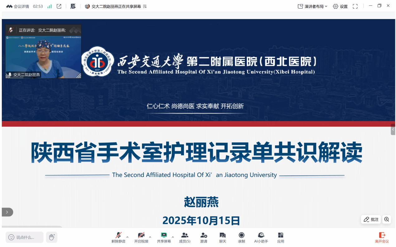 恰逢西安交通大学第二附属医院88周年院庆系列学术活动蓬勃开展之际,2025年10月15日下午,西安交通大学第二附属医院麻醉手术党支部成功举办陕西省手术室质量控制中心主题为“规范书写、精准抢救、保障安全”的线上规范化培训。