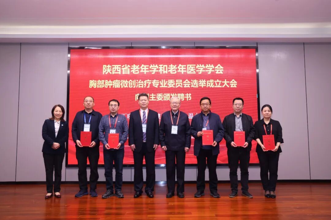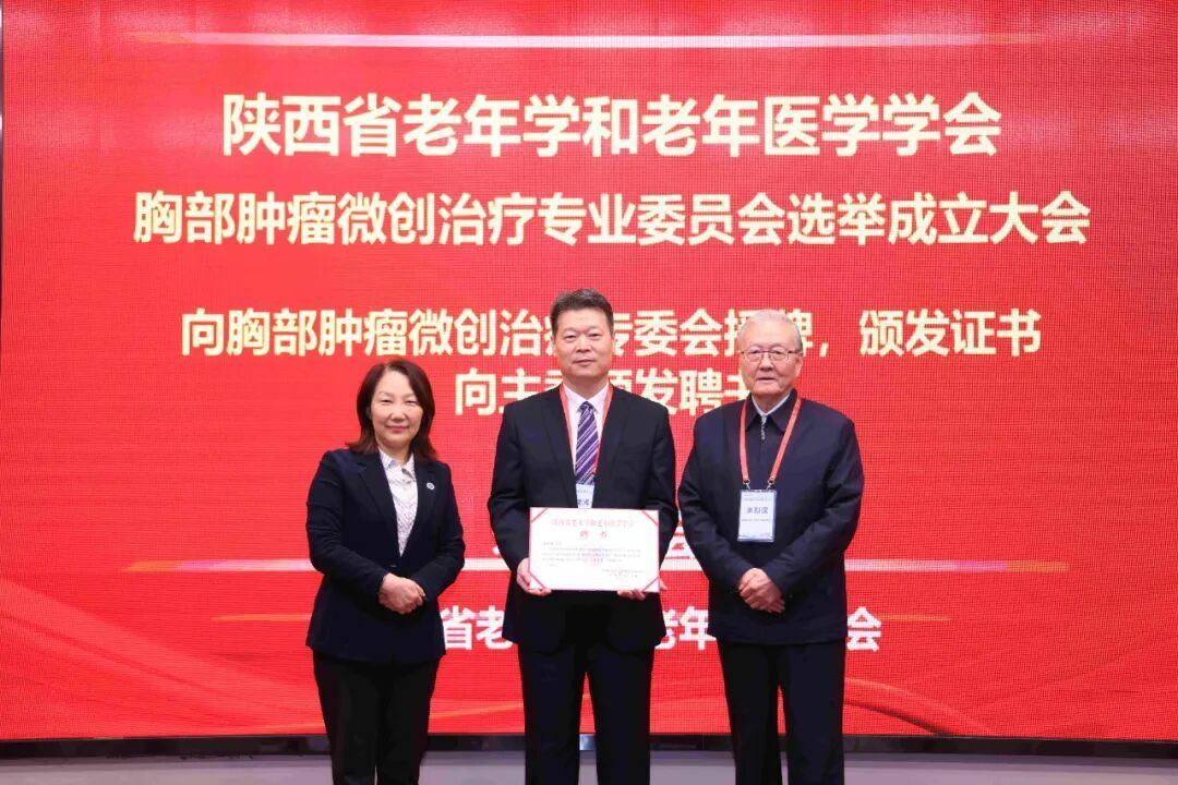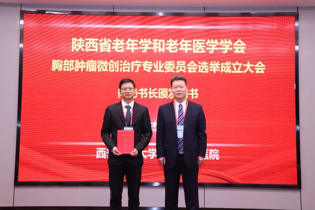 陕西省老年学和老年医学学会米烈汉会长和西安交通大学第二附属医院党委书记刘昌教授共同为第一届胸部肿瘤微创治疗专业委员会授牌、颁发证书,并向主委颁发聘书。