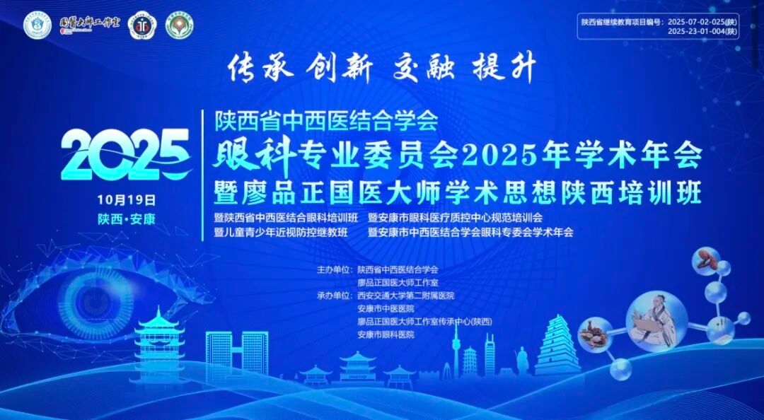 2025年10月19日,由陕西省中西医结合学会、廖品正国医大师工作室主办,西安交通大学第二附属医院、安康市中医医院等多家单位联合承办的“陕西省中西医结合学会眼科专业委员会2025年学术年会暨廖品正国医大师学术思想陕西培训班”在陕西安康圆满落幕。本次大会作为省内中西医结合眼科领域的年度学术盛会,以高规格、广覆盖、深融合为特点,成功搭建了一个传承大师精髓、交流前沿理念、培育青年人才的高端平台,为推动陕西省眼科事业的中西医协同发展注入了强劲动力。