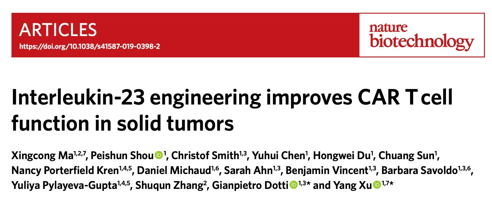 此前张淑群、马兴聪教授团队已在NatureBiotecnology(IF 41.7)发表前期相关研究《可诱导性自分泌 IL-23 的四代 CAR-T 细胞模型的构建及其对实体瘤的疗效验证》(Interleukin-23 engineering improves CAR T cell function in solid tumors),并基于该研究成果获批发明专利一项,为推进具有自主知识产权的细胞免疫治疗技术的临床应用奠定了基础。