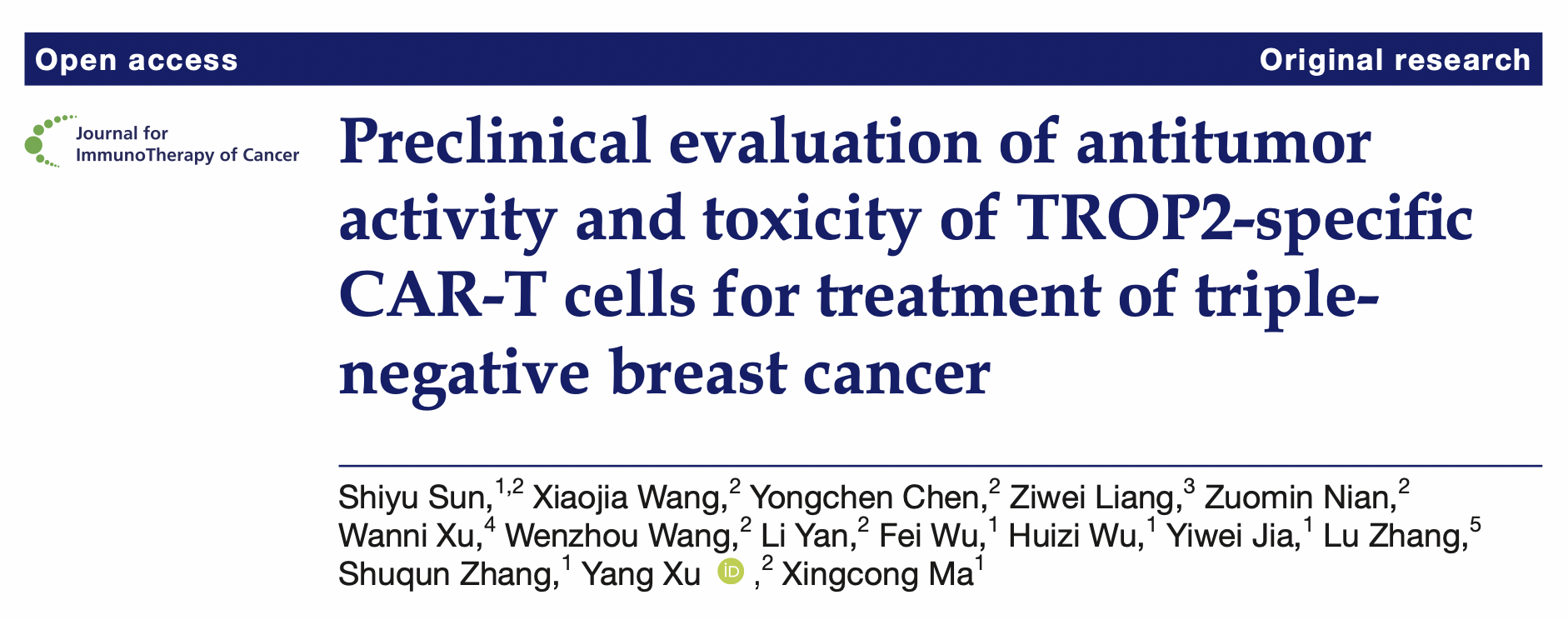 实体肿瘤的CAR-T疗法一直是全球范围内未攻克的难题,针对乳腺癌,靶向TROP2的CAR-T疗法仍处早期阶段。近年来,西安交通大学第二附属医院乳腺疾病诊疗中心张淑群、马兴聪教授团队专注于乳腺癌CAR-T疗法的探索,并在近期获得重大突破,研究成果《Preclinical evaluation of antitumor activity and toxicity of TROP2-specific CAR-T cells for treatment of triple-negative breast cancer》聚焦实体瘤治疗难点,首次揭示靶向TROP2的CAR-T细胞治疗三阴性乳腺癌临床前评估的新发现,发表在免疫治疗领域顶级期刊《癌症免疫治疗》(Journal for ImmunoTherapy of Cancer)上。