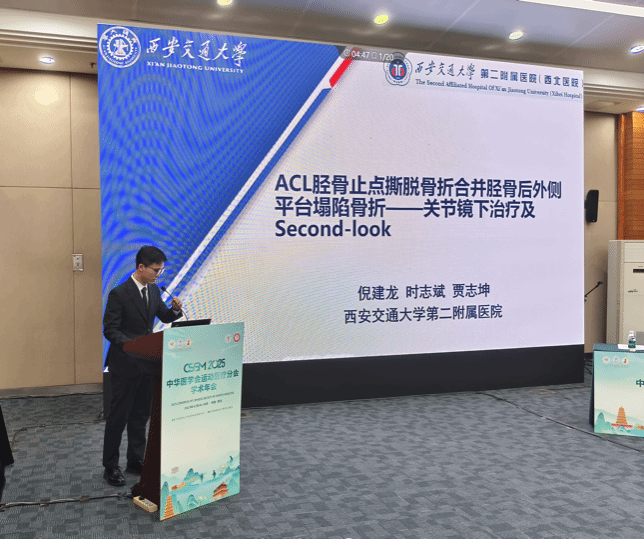 刘瑞宇教授团队就《股骨颈皮质厚度在多区域DXA骨量评估中的优势表现》作大会发言。该研究依托科室多年临床病例积累,由团队共同完成基线资料分析、影像学评估、术后髋关节功能动态随访及健侧对比等多维度系统评估,为优化治疗策略、提升患者功能预后提供重要循证依据。倪建龙副教授围绕《ACL胫骨止点撕脱骨折合并胫骨后外侧凭他塌陷骨折-关节镜下治疗及Second-look》分享其创新治疗路径,系统梳理了临床诊疗要点与优化路径,为推动该类疾病的标准化治疗提供了实践指导。宋启春副教授围绕《RAMP区面积占比较小导致内侧半月板后根撕裂风险增加》,通过临床病例影像分析与随访验证,明确胫骨髁间后区解剖结构与半月板后根撕裂的关联性,为病因机制研究及高风险人群干预提供参考。