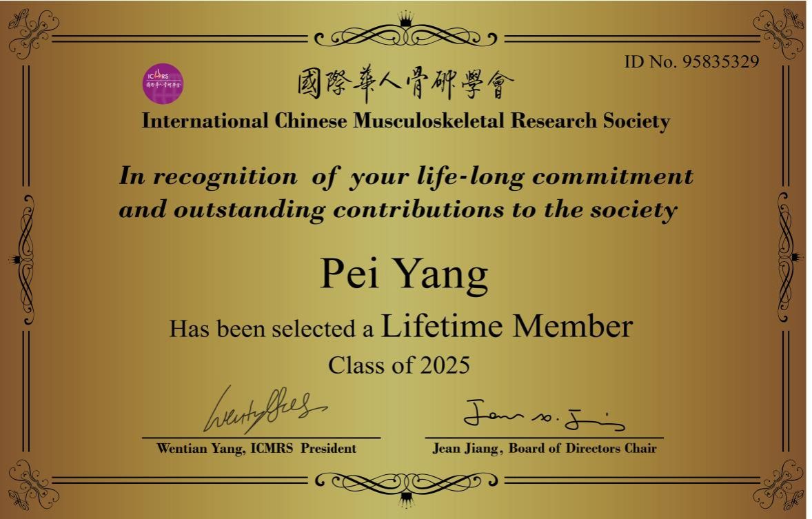 国际华人骨研究协会是全球华人骨科学术交流与合作的核心平台,汇聚了海内外顶尖骨科专家学者,其终身会员称号旨在表彰在骨科基础研究、临床诊疗、学科建设等方面做出卓越贡献、且长期致力于推动国际华人骨科学术发展的专家。此次遴选经过严格的资格审核、学术成果评估及同行评议等多环节流程,杨佩教授的成功当选,标志着其学术地位与行业贡献获得国际华人骨科界的权威肯定。