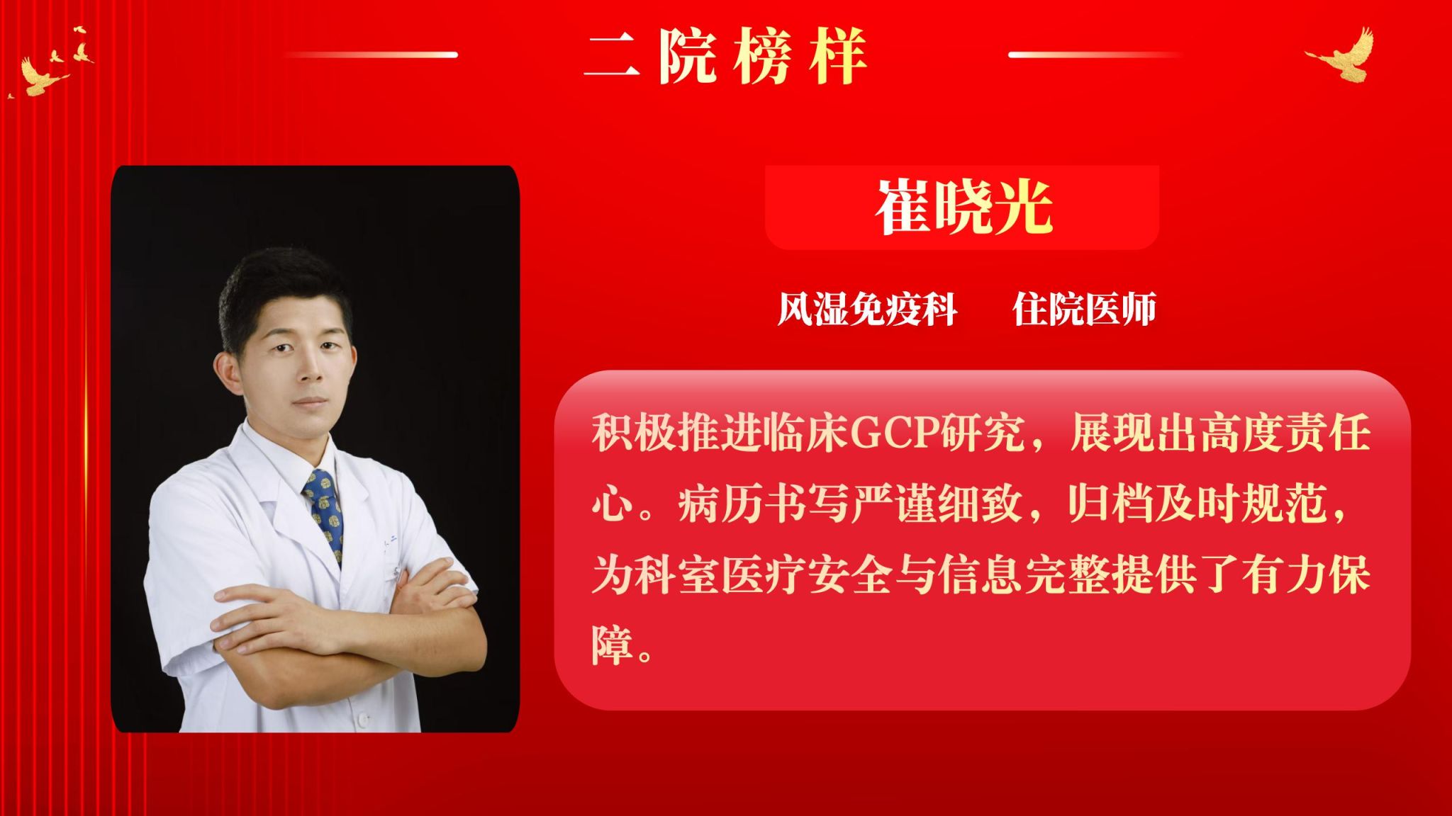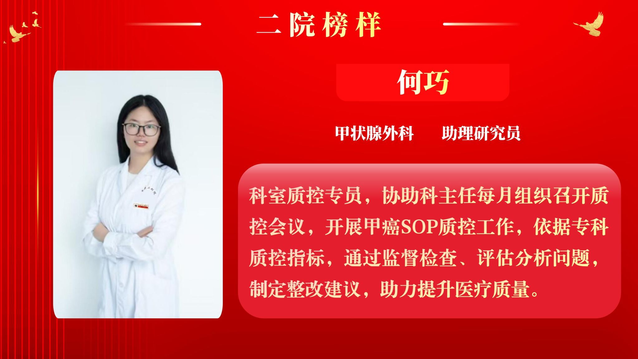 仰望星空有对标,脚踏实地有行动,平凡的是岗位,不凡的是精神。此次“二院榜样”月度人物共评选出8名,他们分别是:肿瘤内科主管护师马莉、急诊科副主任护师王丽娜、运动医学与小儿骨科病区护师冯倩、甲状腺外科助理研究员何巧、老年综合内科住院医师张秀丽、老年普通外科住院医师高志峰、风湿免疫科住院医师崔晓光、核医学科住院医师彭艳。