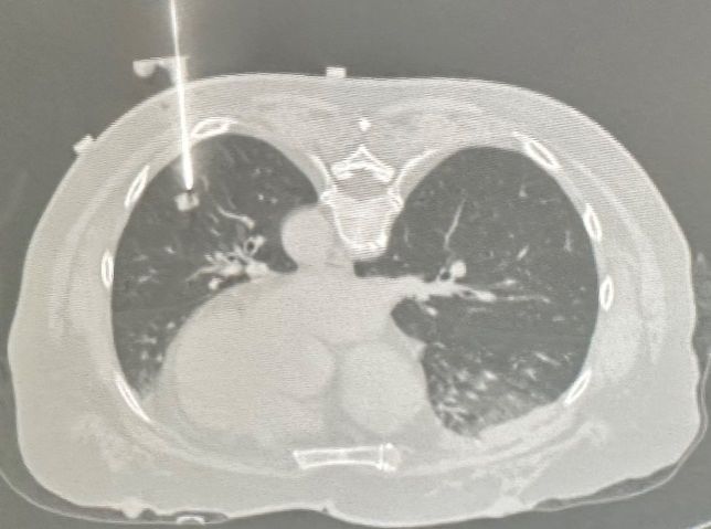 本次完成的两例手术均体现出机器人辅助穿刺的系统优势:患者一为乳腺癌新辅助治疗中,左肺下叶存在10mm微小结节;患者二为右肺下叶后基底段15mm结节。术前通过CT扫描于体表放置定位标记,系统自动识别并重建肺部三维模型,医生据此规划穿刺路径。术中,机器人机械臂在光学导航引导下精准定位,辅助术者将同轴穿刺针一次到位。CT复查确认针尖抵达目标病灶,活检取材满意。两例手术均仅耗时约十分钟,术后仅见少量肺内出血,未发生气胸等并发症,患者无明显不适。