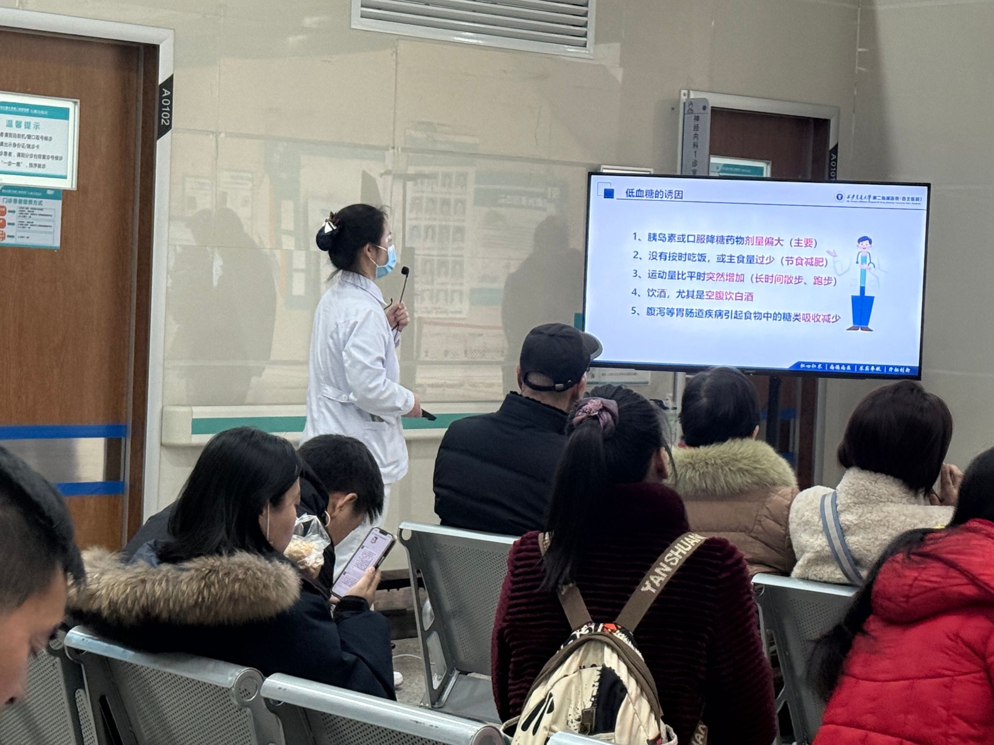 为帮助群众树立全面的血糖管理理念,提升对低血糖的防范意识和应对能力,1月14日上午,在大明宫院区门诊一楼大厅举办了一场以“不可小觑的低血糖”为主题的科普宣讲活动。本次活动由院区管理办公室护士杨姣姣主讲,实用的内容吸引了众多患者及家属驻足聆听。