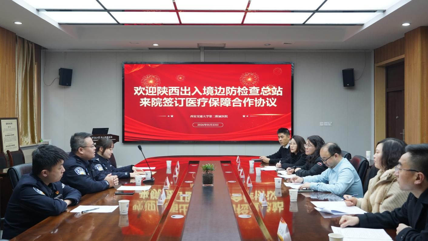 2026年1月23日上午,陕西出入境边防检查总站与交大二附院正式签订医疗保障合作协议。陕西出入境边防检查总站后勤保障处副处长惠海军一行,与交大二附院医务部常务副主任王虎清及相关科室负责人共同出席签约仪式。