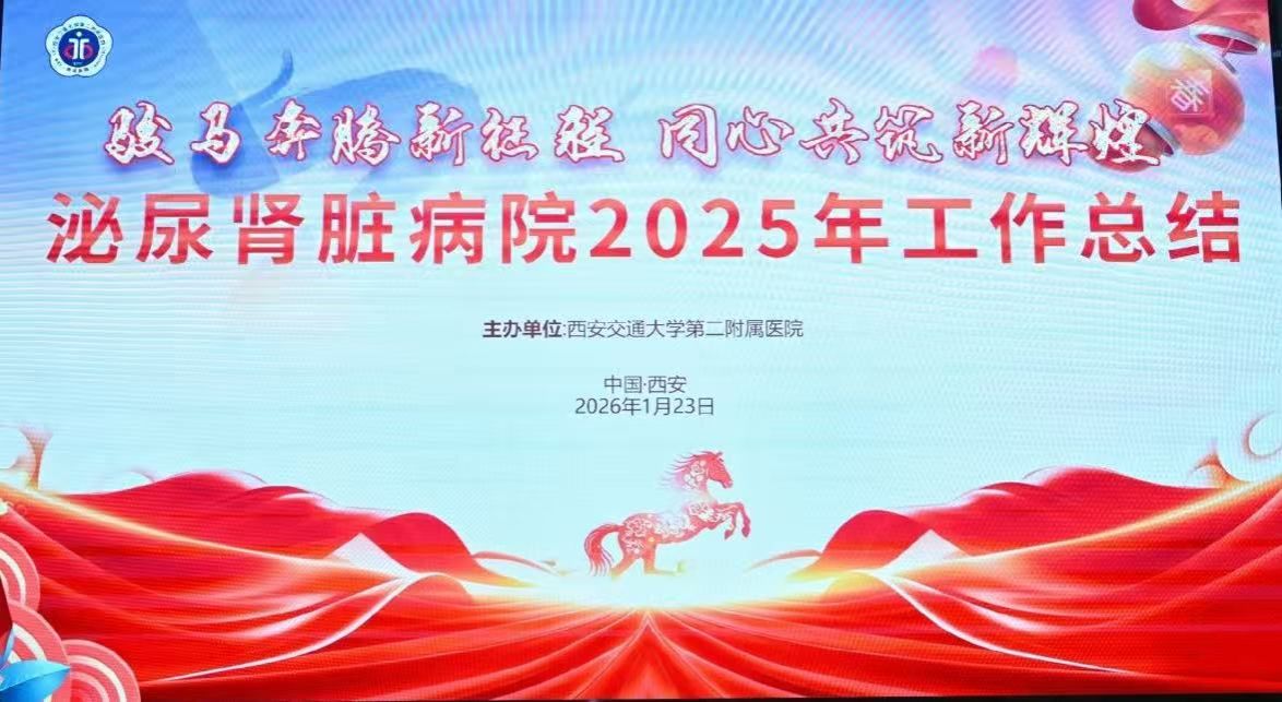 律回春渐,新元肇启。1月23日,西安交通大学第二附属医院泌尿肾脏病院“骏马奔腾新征程 同心共筑新辉煌”2025年度工作总结会暨2026年迎春会在南院隆重举行。全体医护人员齐聚一堂,回望奋斗征程,共绘发展蓝图,用一场温暖又热烈的盛会,为过去一年画上圆满句号,也为新一年的奋进吹响号角。