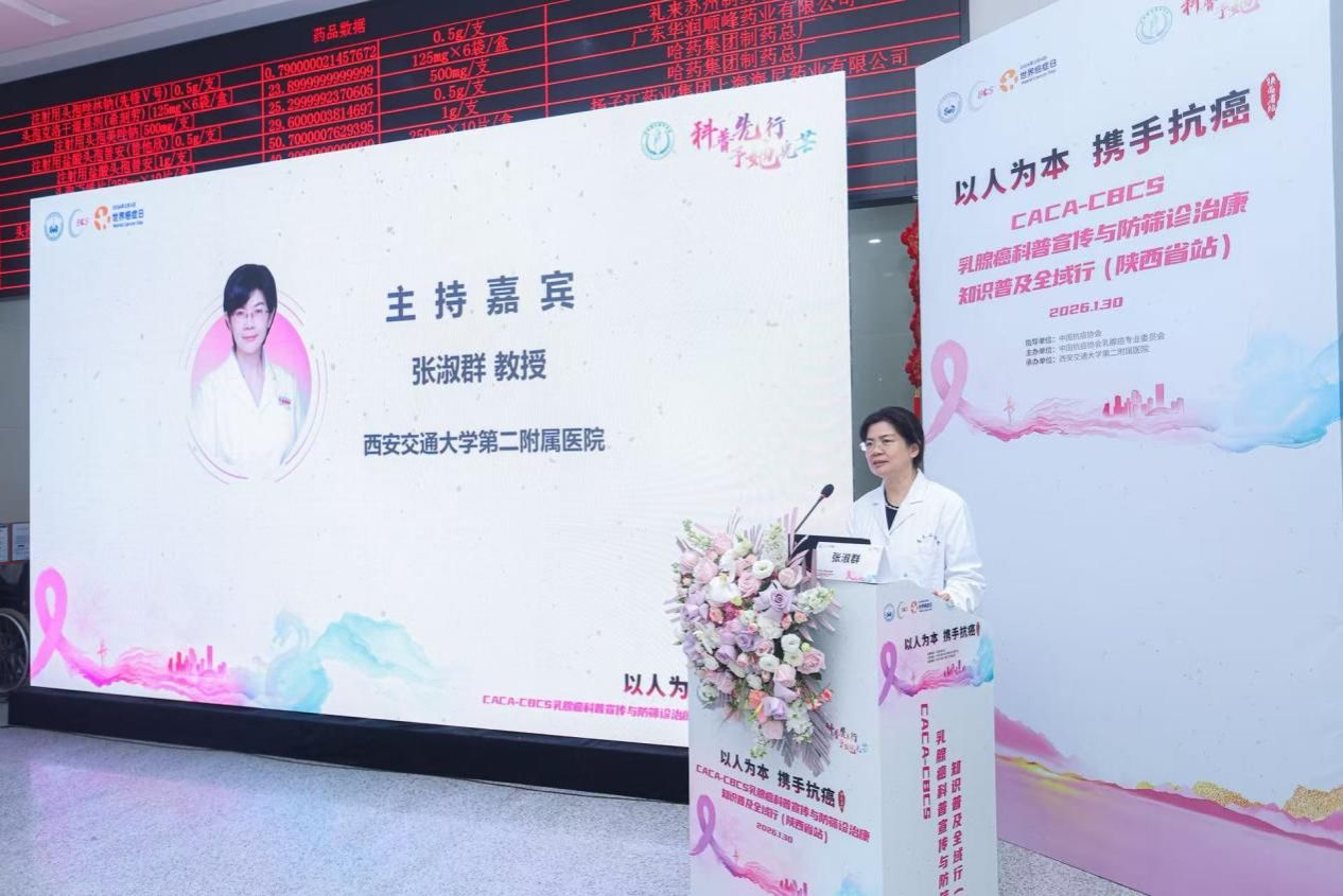 2026年1月30日上午,由中国抗癌协会、中国抗癌协会乳腺癌专业委员会(CACA-CBCS)主办的、西安交通大学第二附属医院承办的“循象问道 和合共生 ——2025CACA 乳腺癌科普全域行(西安站)暨 CACA-CBCS 乳腺癌科普宣传与防筛诊治康知识普及全域行”活动在西安成功举行。本次活动旨在提升公众对乳腺癌防治知识的认知,加强医患沟通,推动乳腺癌早筛、早诊、早治理念的普及,为女性构筑起一道坚实的健康防线。活动在西安交通大学第二附属医院大明宫院区举行,吸引了众多医护人员、患者及家属参与。
