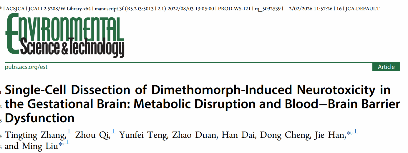 近日,西安交通大学第二附属医院妇产科张婷婷教授团队在环境科学与健康领域国际顶级期刊《环境科学与技术》(Environmental Science & Technology,影响因子11.4)上发表题为“Single-Cell Dissection of Dimethomorph-Induced Neurotoxicity in the Gestational Brain: Metabolic Disruption and Blood-Brain Barrier Dysfunction”的研究论文。该研究首次从单细胞水平系统揭示了常用杀菌剂烯酰吗啉(Dimethomorph, DMM)在孕期暴露中对胎儿大脑发育的潜在风险及其作用机制,为农药安全评估与神经保护策略提供了重要科学依据。